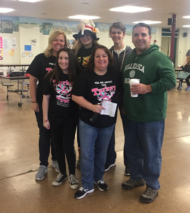 Volunteering for the annual Billerica 5k Turkey Trot is one way April goes above and beyond. Pictured are volunteers – Front Row: Emilee Laske, 9th grade; April; Mark Efstratiou, School Committee; Back Row: Cheryl Green, Nutrition Operations Manager; Victoria Bones, 11th grade; Nolan Rexford, 9th grade.