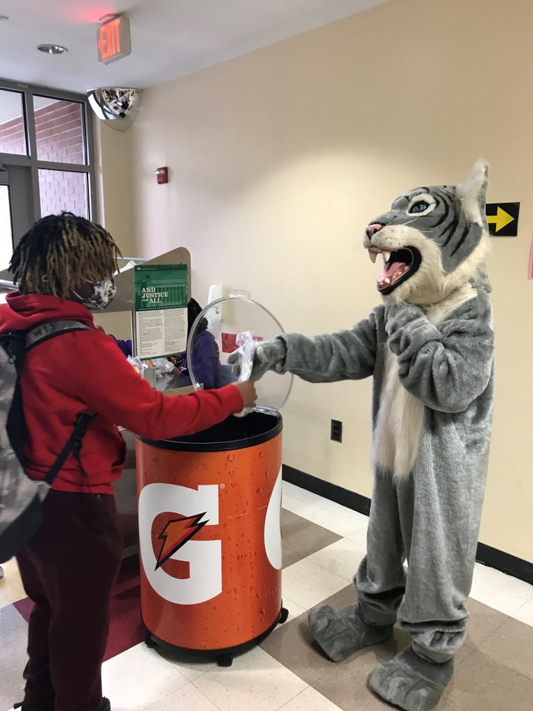 Chattahoochee High School’s (GA) Cougar serving students breakfast from the hallway.