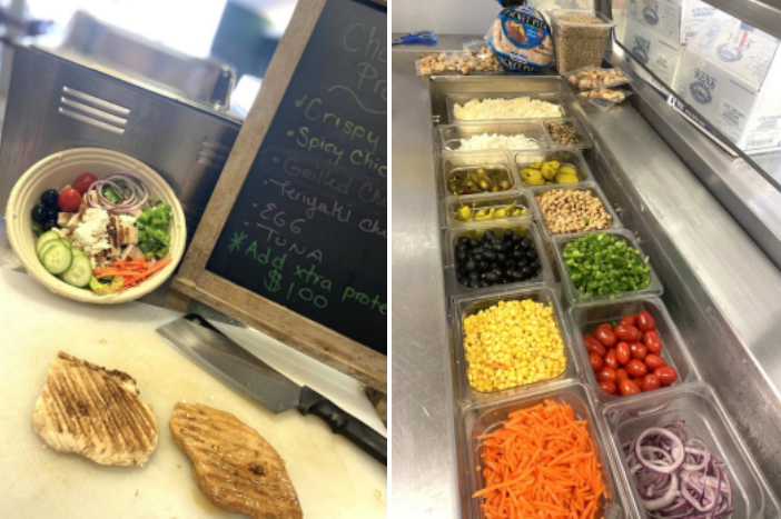In the middle of hot subs and pizza on the serving line, students have the chance to grab freshly cut fruits and vegetables. A colorful salad bar features grilled chicken every day and special food bars offer everything from cheeseburger bowls to burrito bowls on different days of the week.