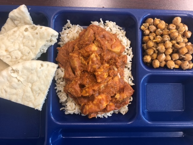 Earth Club is another enrichment program offered that the school nutrition team has been involved with. The after-school club does a variety of activities focused on environmental awareness, including trying to develop vegetarian meals. Last year, they came up with a recipe for Chickpea Tikka Masala. Early worked with the students on recipe how-to’s as well as variations from mild to spicy and reviewing proteins that can be added to the traditional Indian dish.