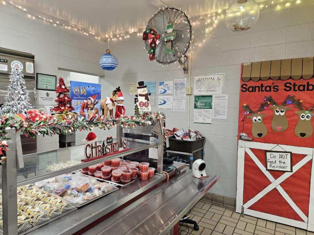 The kitchen elves from the Lowndes School Nutrition Program in Georgia created “Santa’s Stable” for students to enter as they head through the lunch lines.