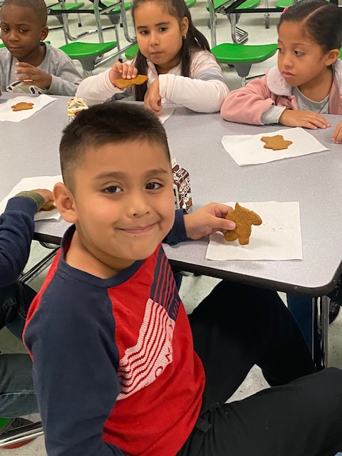 At Eastside Elementary School in Coffee County Schools (GA), kindergarten teacher Nichole Dale asked the café manager for help with a STEAM activity. In class, students read several versions of “The Gingerbread Man” to learn about comparisons and contrasts and did some experiments with gingerbread cookies. After, they went to the school’s kitchen to learn about food safety, where eggs come from and how to keep cookies from sticking to the pan.