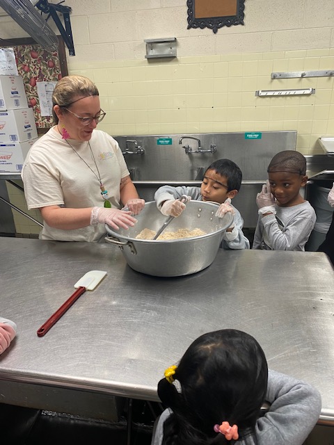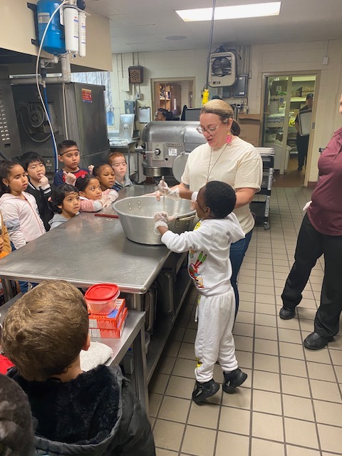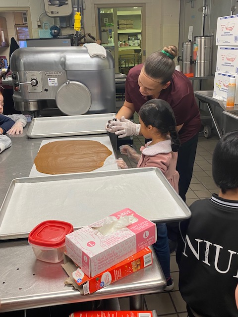“We talked about how chemical reactions happen when the butter, eggs and dough are mixed. We used math skills to know how many eggs and cups of water to mix with because we had two boxes and each box needed one part of the ingredient,” said Nichole Dale. “It was great for the students to have the learning opportunity with our school community partners on a personal level such as our wonderful lunchroom staff.”