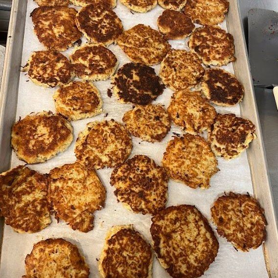 They shared a family recipe and the nutrition department purchased the necessary ingredients. The students stayed after school for about three hours working in the kitchen peeling, chopping, grating, mixing, squeezing and frying the latkes.