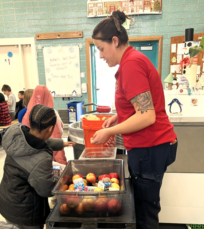 The program, launched in 2021, began with the kitchen staff sorting food scraps into buckets for donation. A year later, Ogden expanded the initiative to the lunchroom, encouraging students to get involved in the effort. She taught them to sort their leftovers into designated bins—one for food waste, one for recyclables, and one for trash—making sustainability a part of their daily routine.