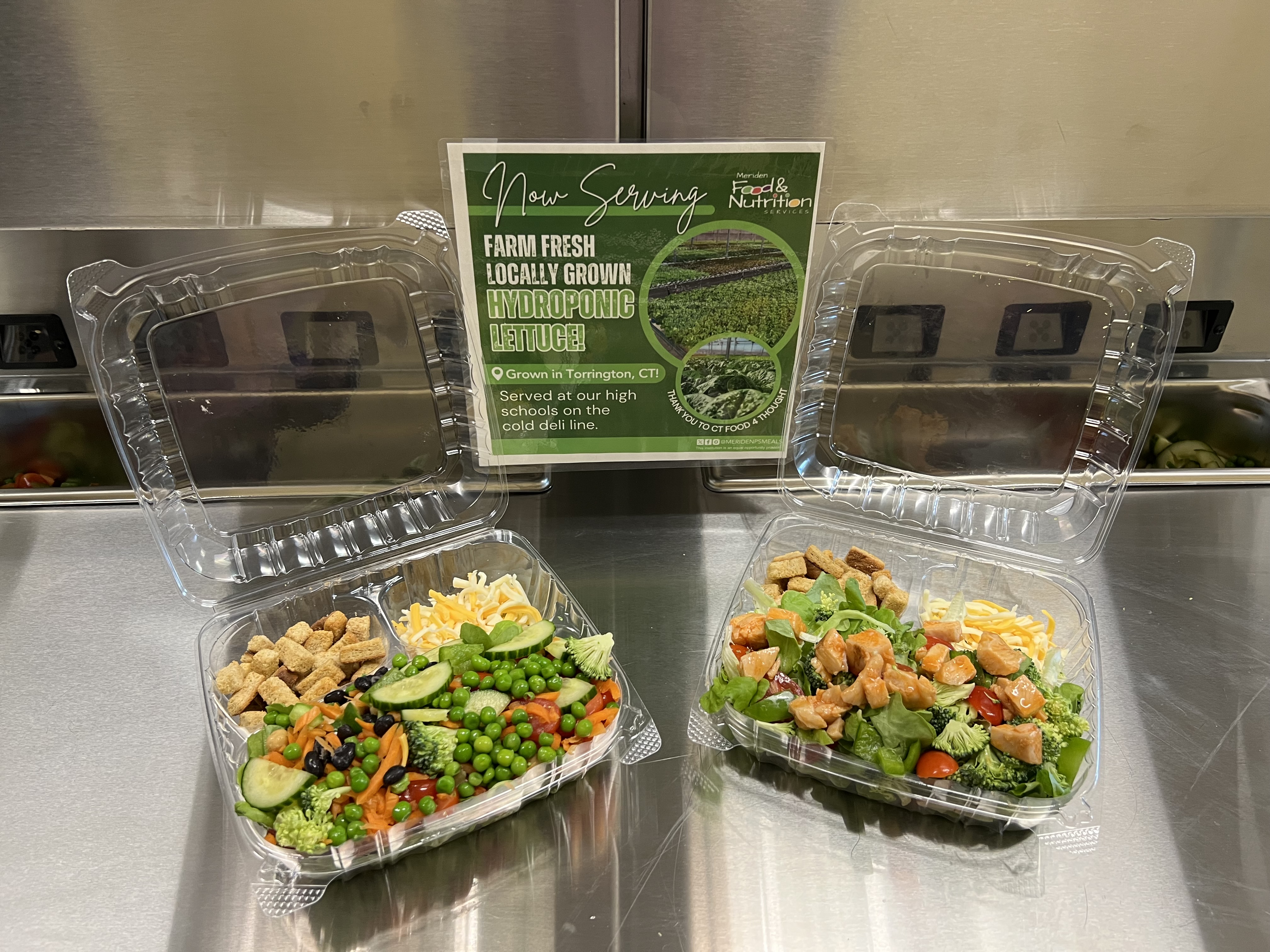 Meriden’s Food & Nutrition Department ties the addition of the touchless salad bar to its broader Farm to School goals. The lettuce served at Platt is hydroponically grown in Torrington, CT, and local cheese, pears and apples come from nearby orchards and dairies.