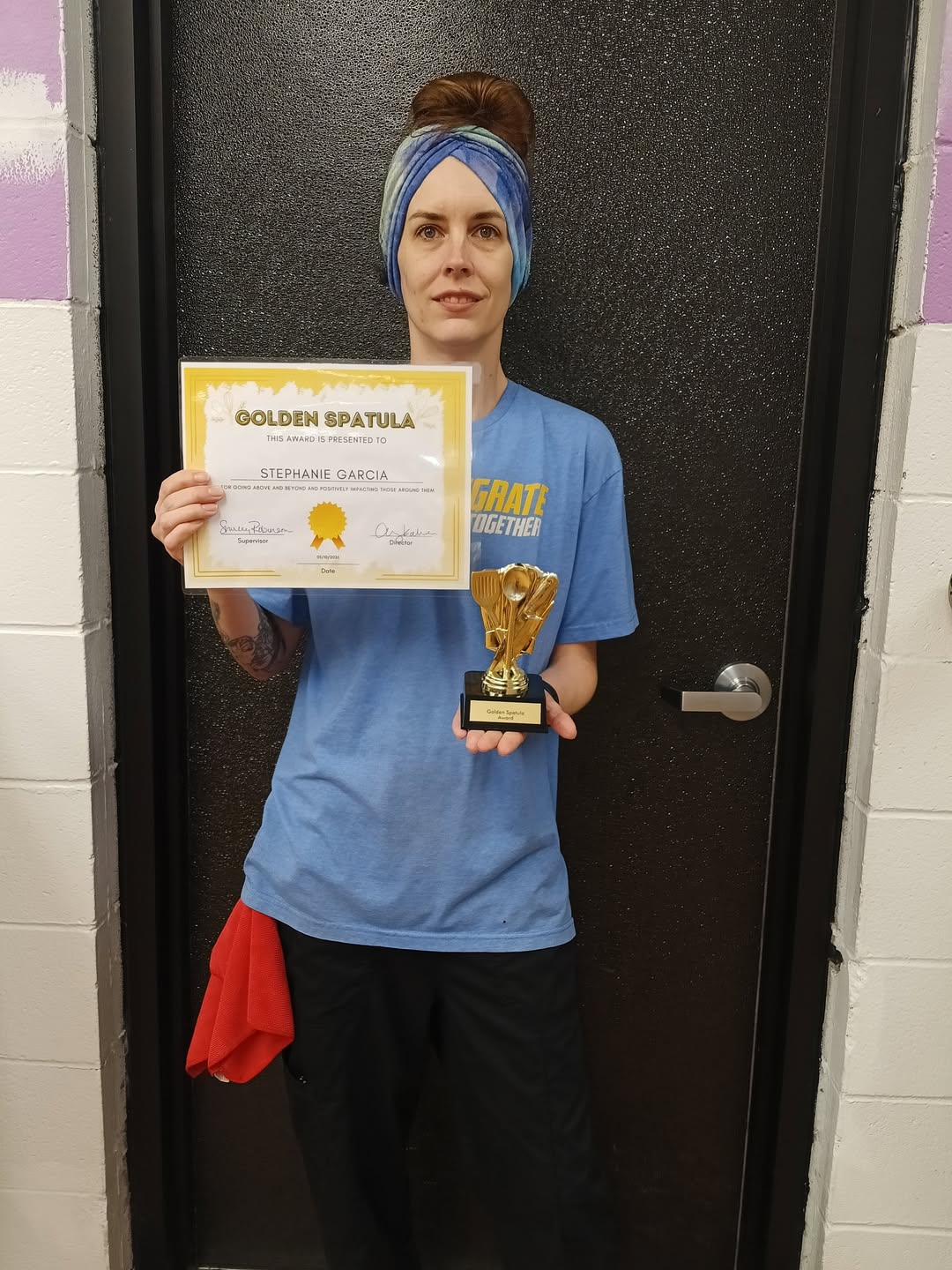 The Golden Spatula is a traveling monthly award given to staff who go above and beyond, both in their work and in how they support their teammates. According to Karshen, recognition has a lasting impact.